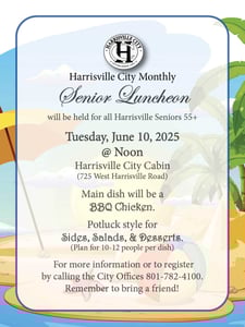The Harrisville City Senior 55+ Luncheon will be held on Tuesday, June 10, 2025, at NOON, at the Harrisville City Cabin located at 725 W Harrisville Road.