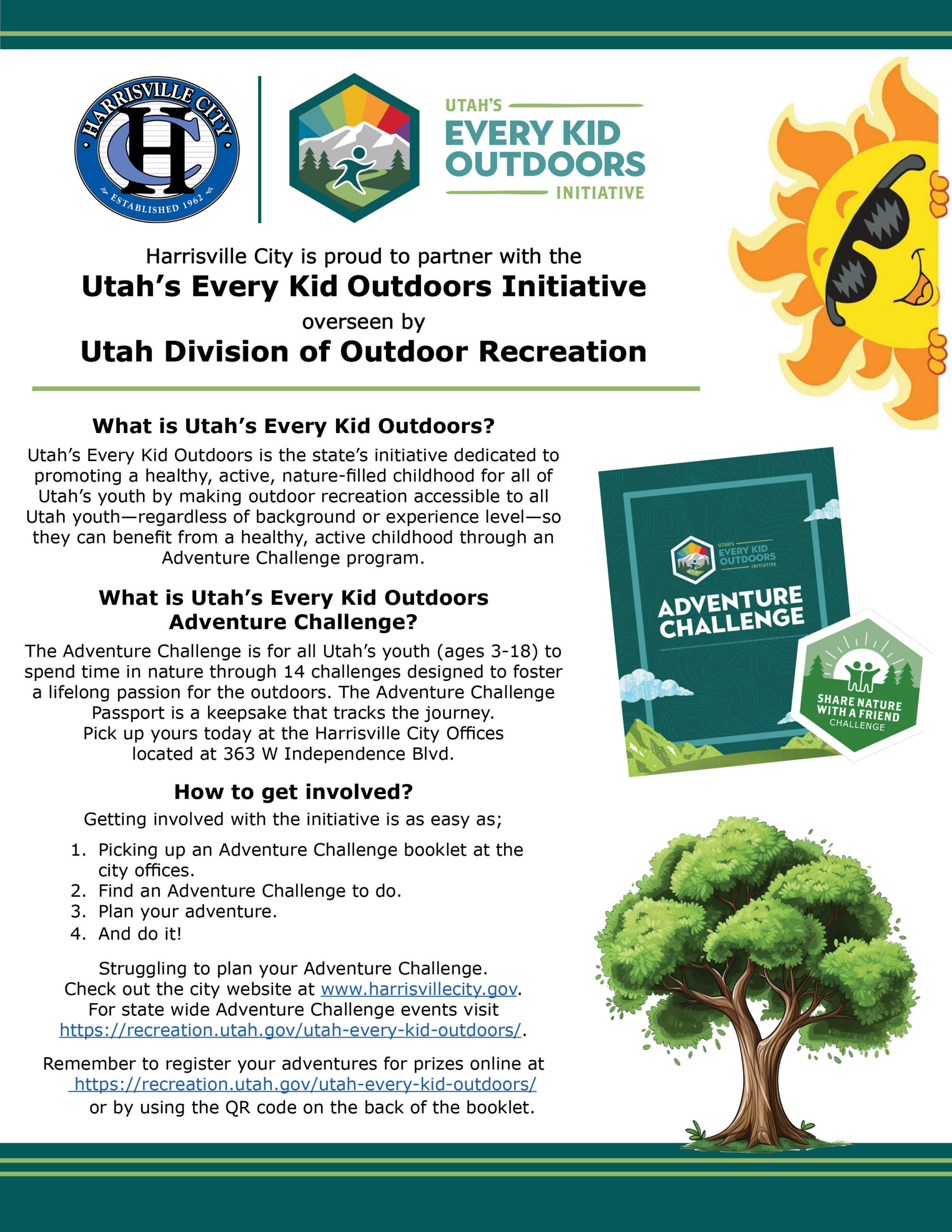 In conjunction with the Get Healthy Utah Designation, Harrisville City is officially registered as a Utah’s Every Kid Outdoor Initiative Distribution Center! What does this mean for our residents? Utah’s Every Kid Outdoors Initiative is now available to our residents. Come collect your Outdoor Adventure Challenge Booklets from the city offices. [For all kids ages 3–18]