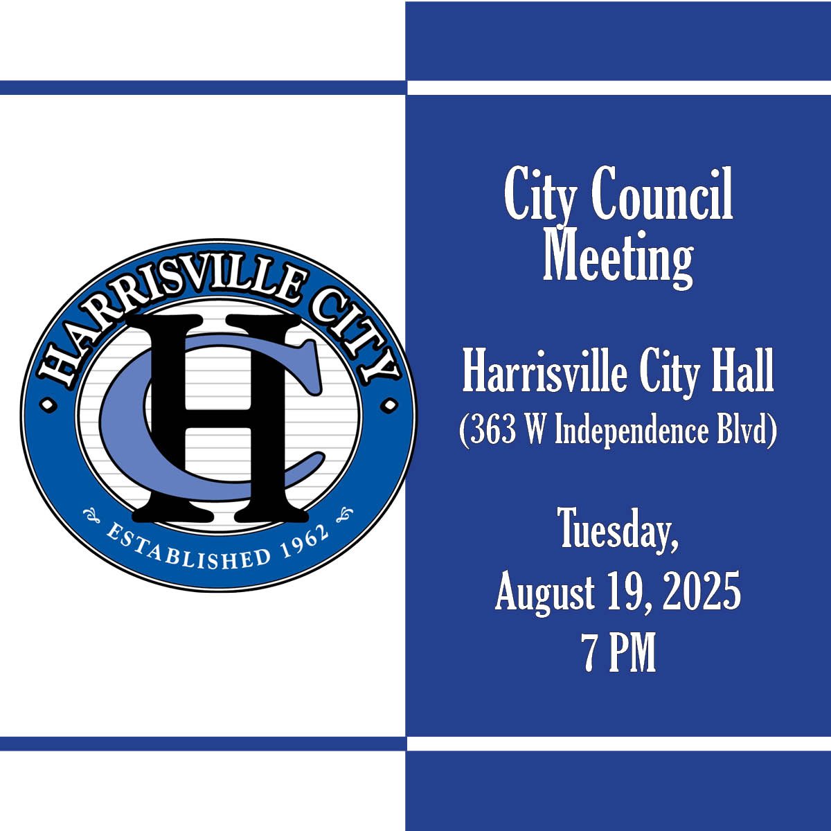 Harrisville City City Council meeting will be held Tuesday, August 19, 2025, at 7:00 p.m. at City Hall, located at approximately 363 W Independence Blvd in Harrisville. All meeting notices for Harrisville City are posted on https://www.utah.gov/pmn/.