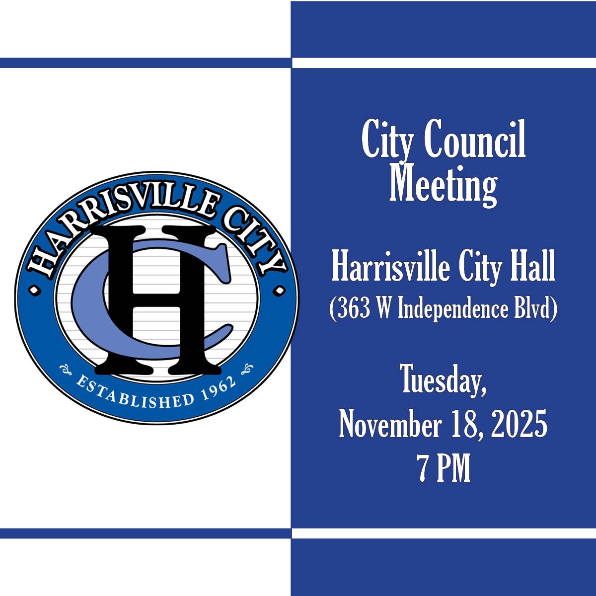 The Harrisville City Council meeting tonight, Tuesday, November 18, 2025, will begin at 7:00 PM in the City Council Chambers located at 363 West Independence Blvd.