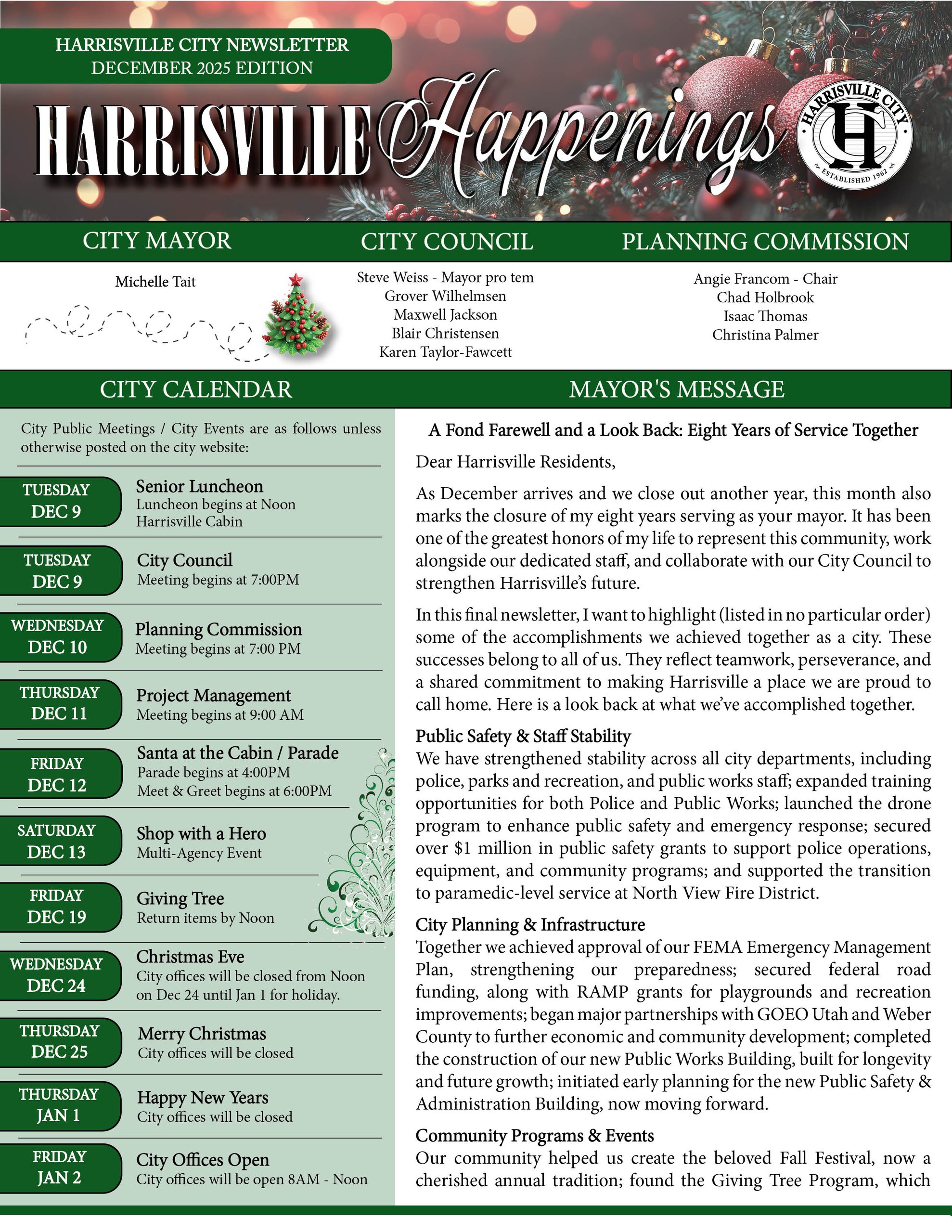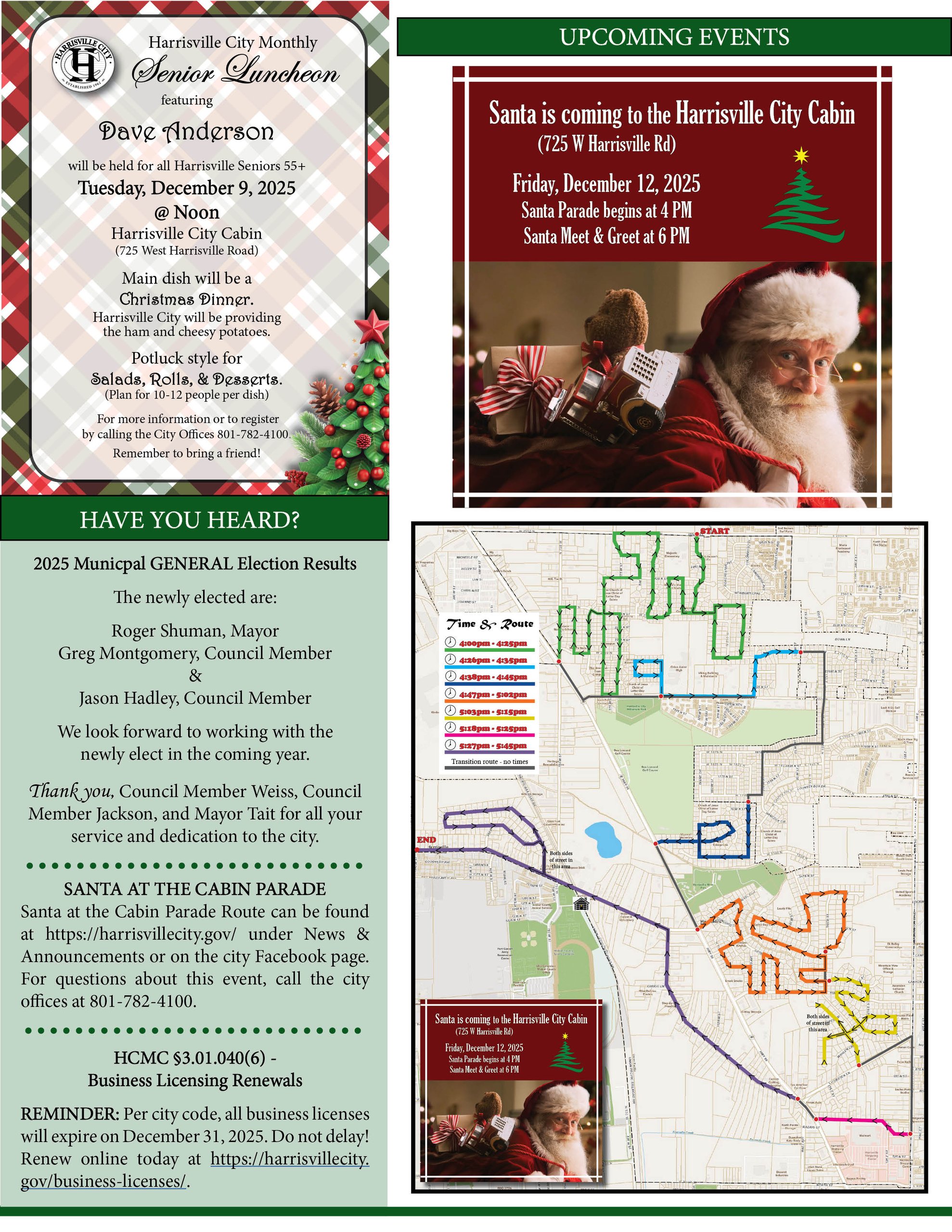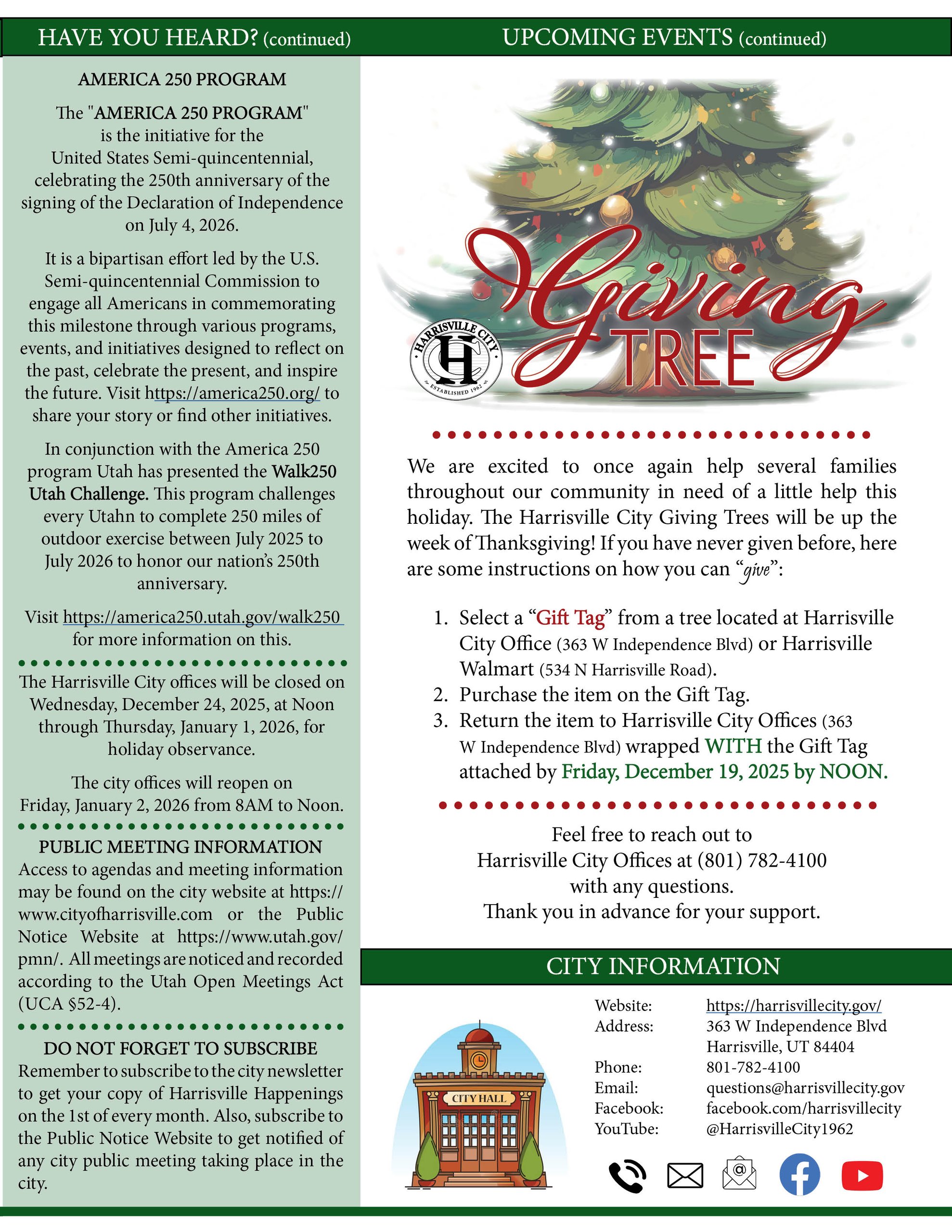 The latest edition of the Harrisville Happenings is ready for your review. This edition is packed with upcoming events such as Senior 55+ Luncheon, Santa at the Cabin, and the Giving Tree. It also holds information on America 250 and Walk250 Utah initiatives along with so much more.