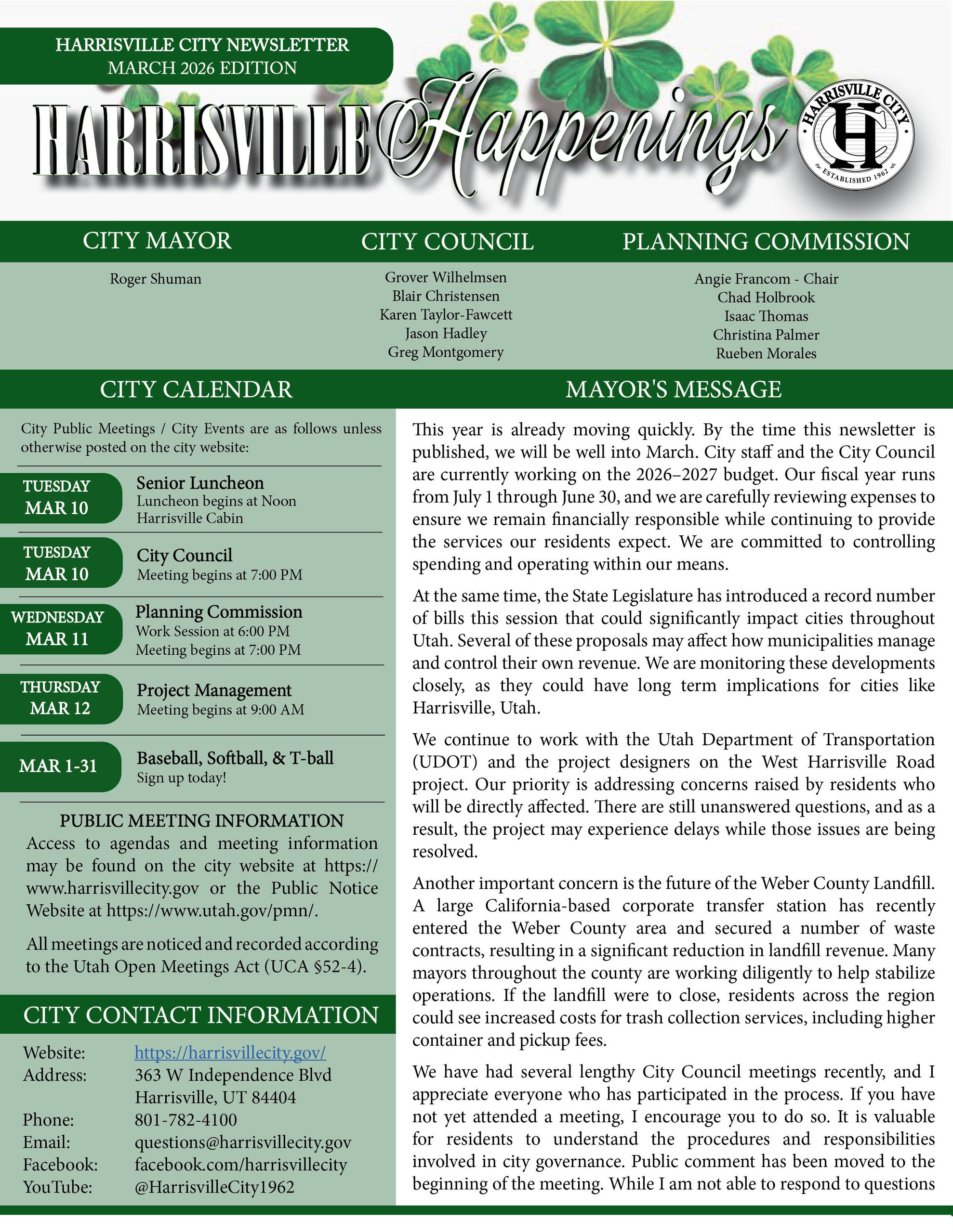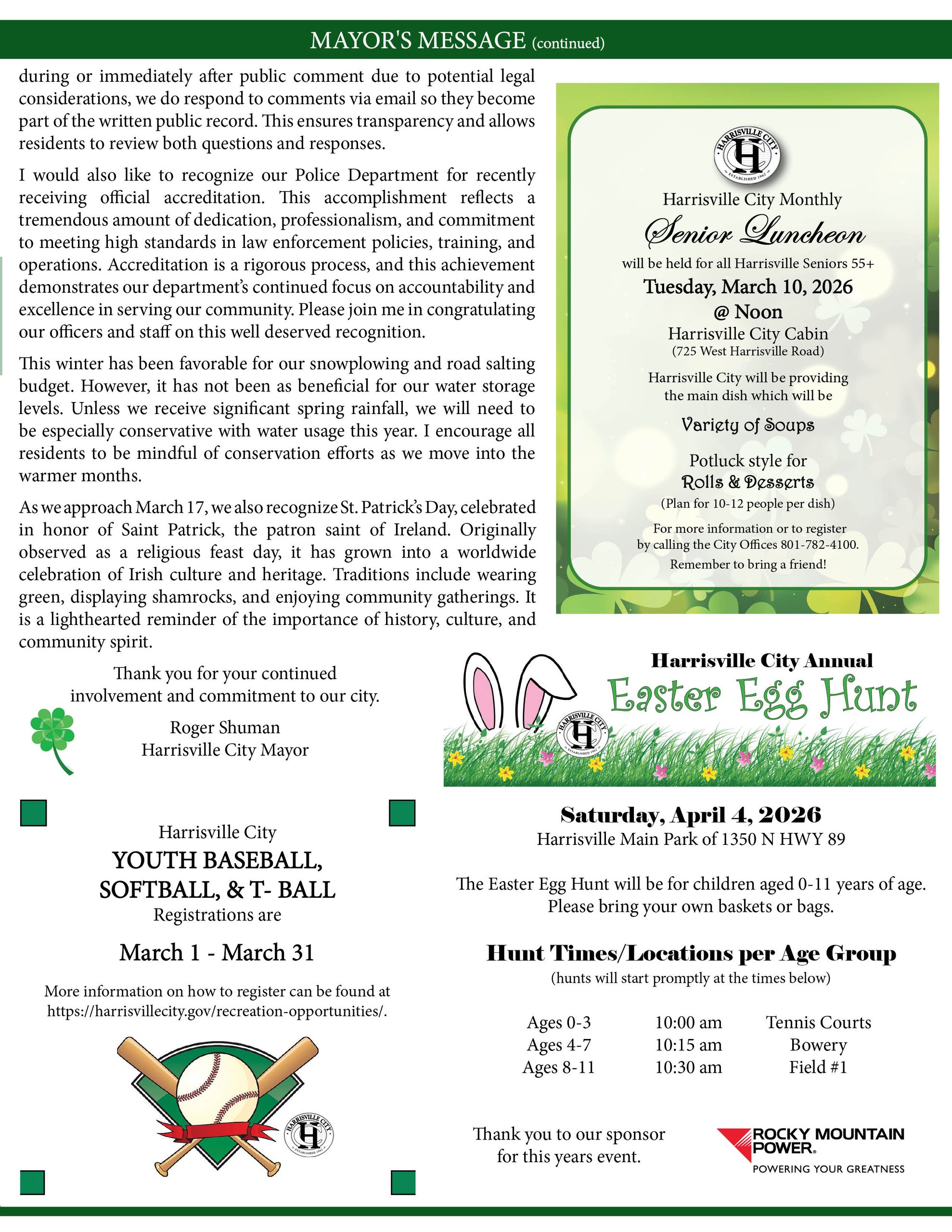This month’s issue includes a message from Mayor Shuman, city meeting dates, Baseball signup information, and more.