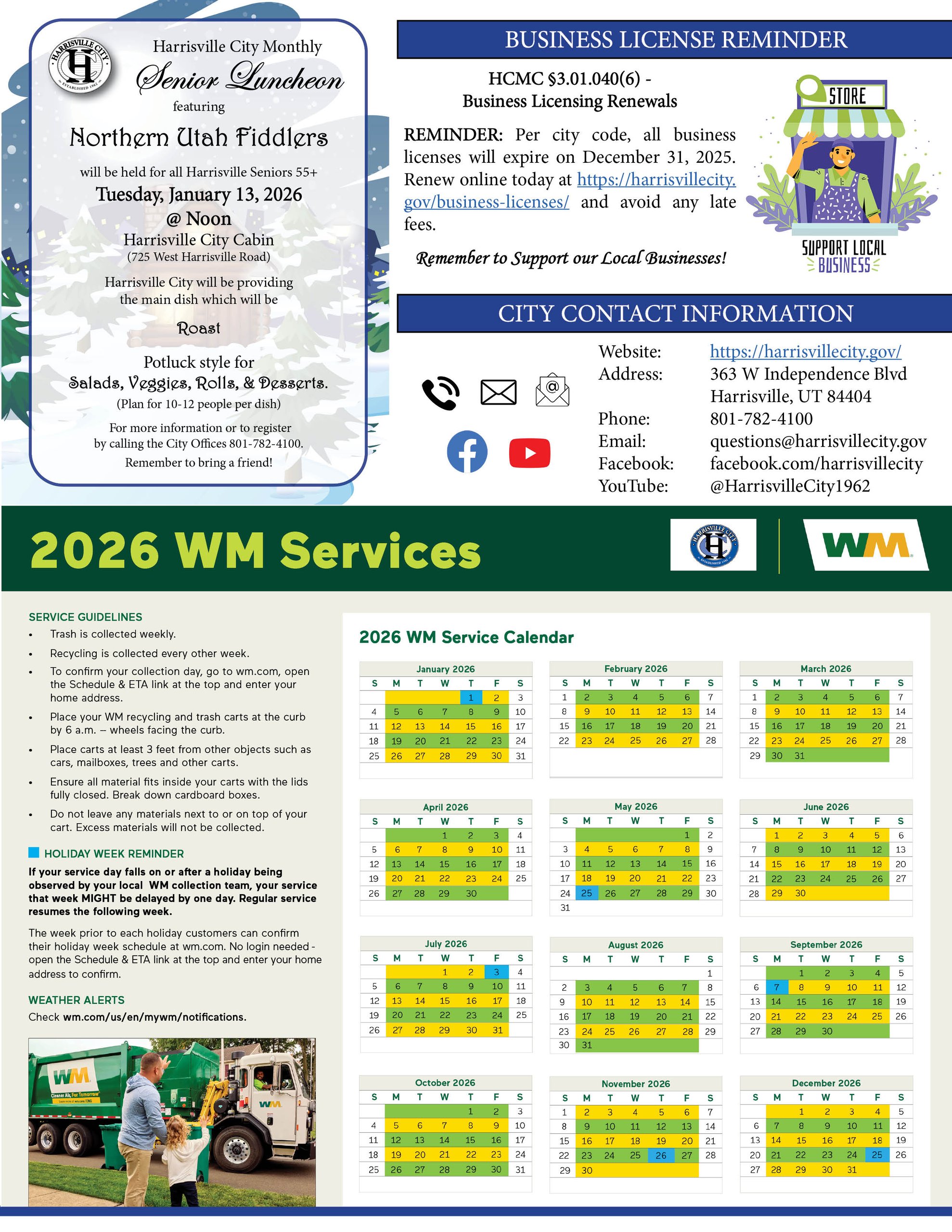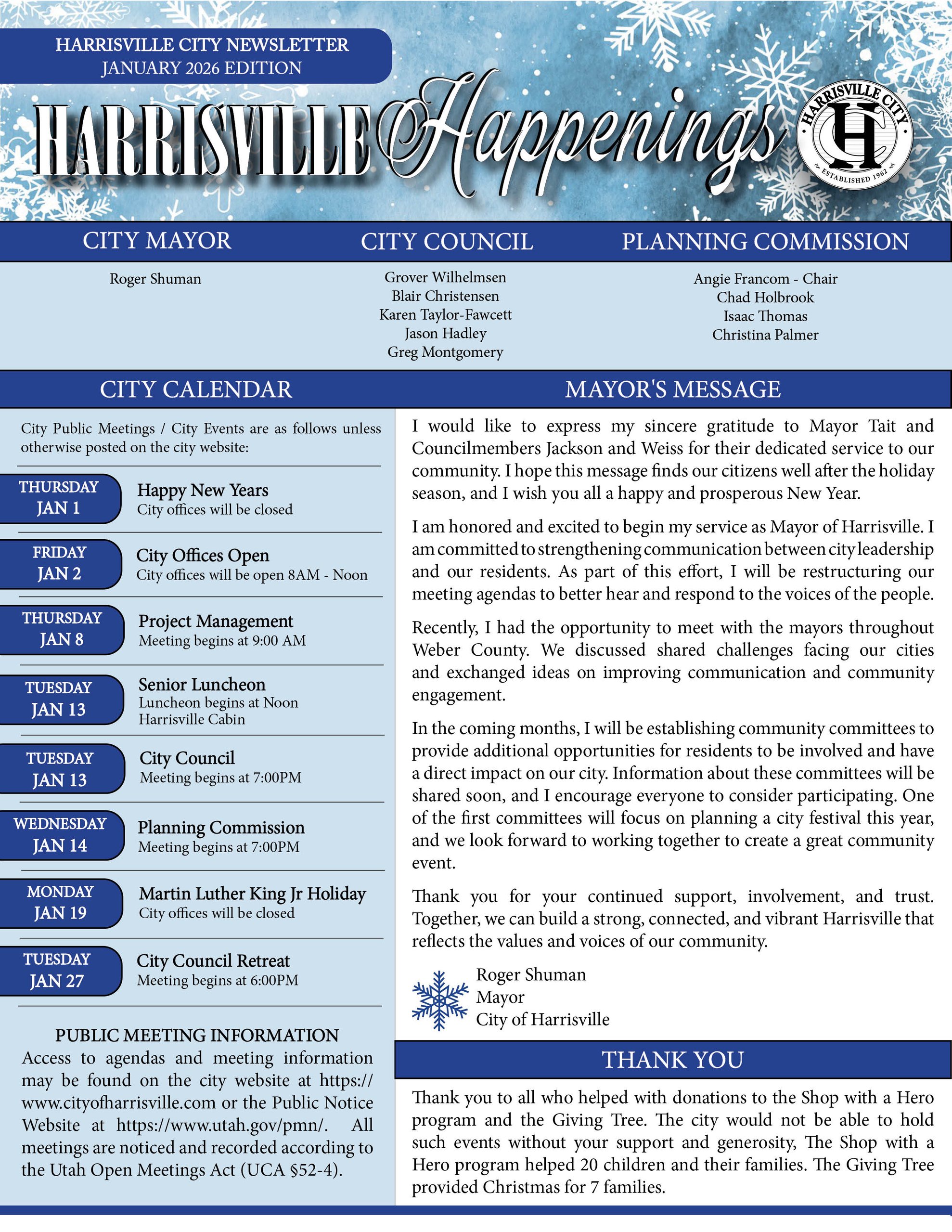 The latest edition of Harrisville Happenings is ready for you to review. This issue contains a message from our newly elected Mayor, Roger Shuman, the Waste Management Recycle Calendar, and more. Happy New Year!