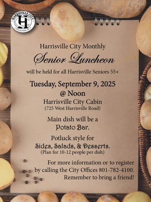 HARRISVILLE SENIOR 55+ LUNCHEON – Today! Don’t forget to call the city offices at 801-782-4100 to sign up for the Harrisville Senior 55+ luncheon to…