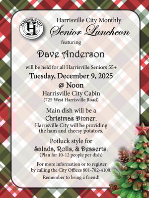 The Harrisville City Senior 55+ Luncheon will be held on Tuesday, December 9, 2025, at Noon. The luncheon will take place at the Harrisville City…