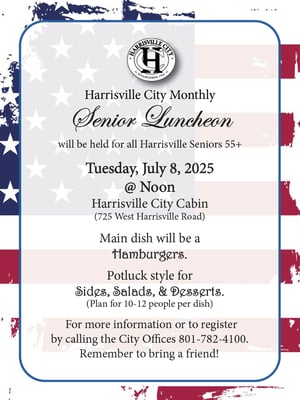 HARRISVILLE SENIOR 55+ LUNCHEON – Today! Don’t forget to call the city offices at 801-782-4100 to sign up for the Harrisville Senior 55+ luncheon to…