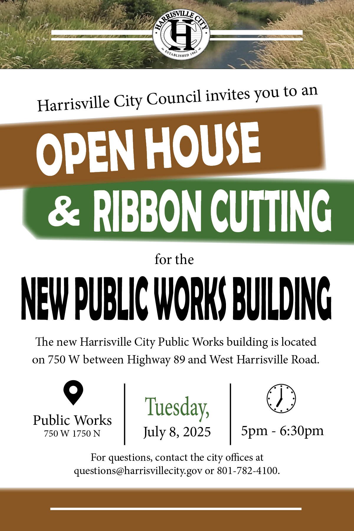 The Harrisville City Council invite you to attend an open house and ribbon cutting ceremony at the New Public Works Building on Tuesday, July 8, 2025 at 5pm. The ceremony will occur at the New Public Works Building located at approximately 750 West 1750 North in Harrisville. The building can be accessed via 750 West between West Harrisville Road and Highway 89.