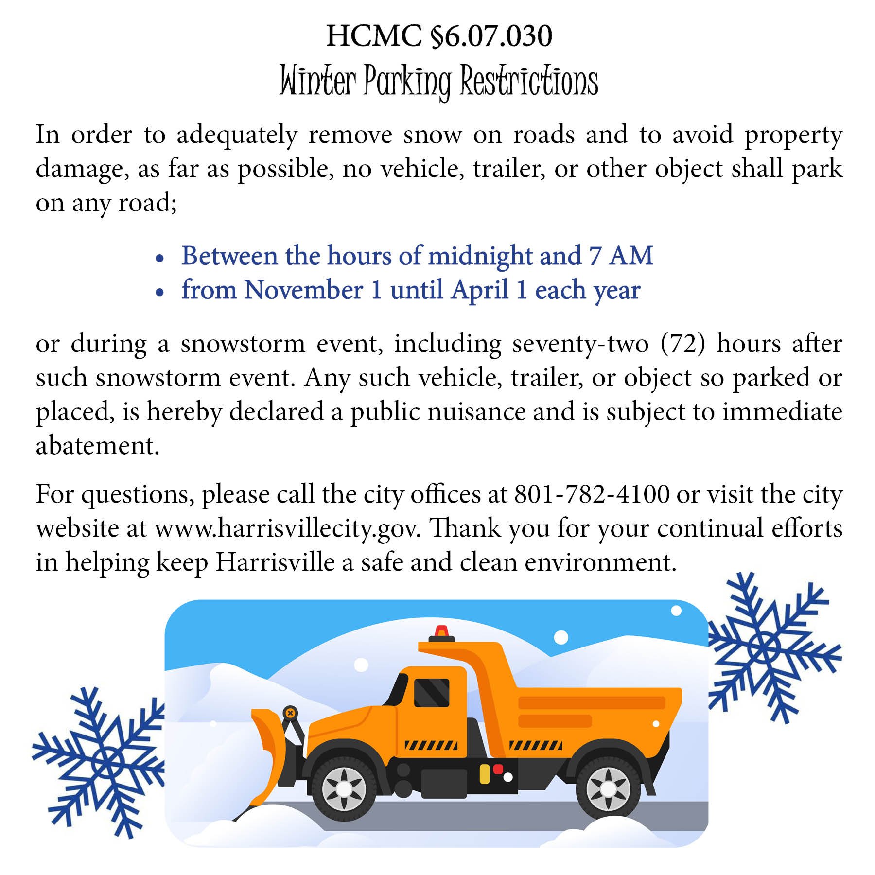 WINTER PARKING RESTRICTIONS REMINDER October 31, 2025 News HCMC §6.07.030 Winter Parking Restrictions Post navigation Previous Previous post: HARRISVILLE CITY RECREATION – Boys BasketballNext Next post: HARRISVILLE HAPPENINGS – November 2025